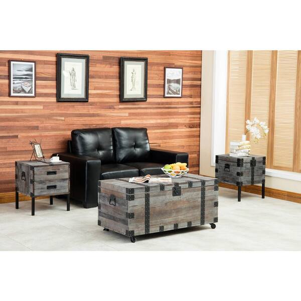 Replicated blackened wood finish with gray textural grain. Home / furniture by collection / rustic pine furniture / coffee tables. Metal base with black powdercoat finish. This coffee table set comes standard in our medium finish but can be ordered in other colors. Flat top steamer trunk antique vintage flat top trunk coffee table movie prop horse tack trunk industrial soho.